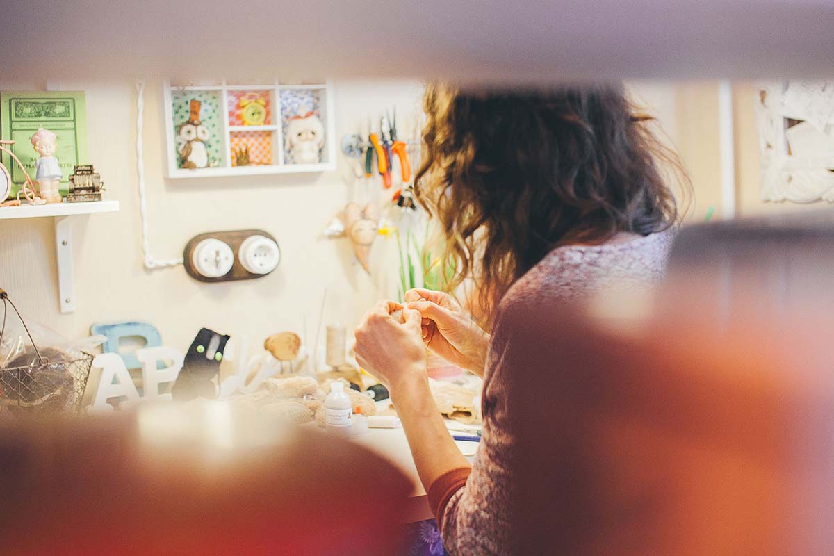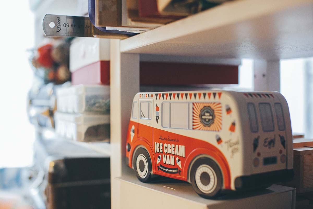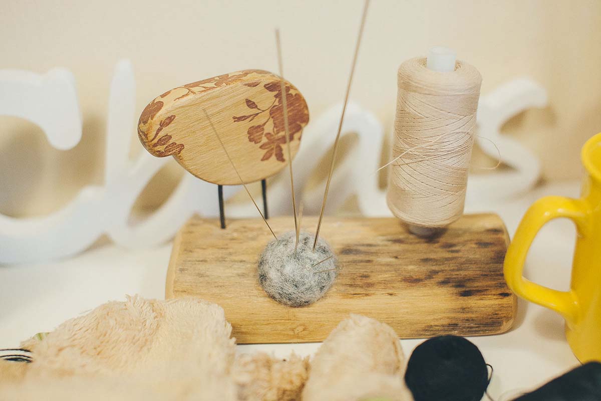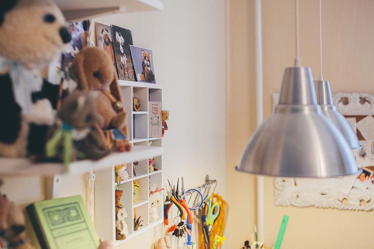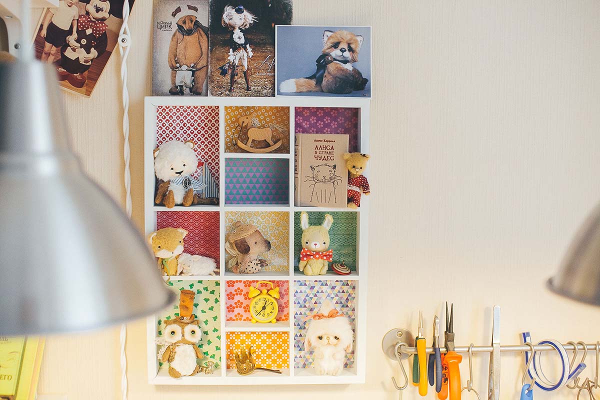 I invented and renovated this space by myself. It's light, warmth and cosy place. There is permanent creative mess here but nonetheless all is on it's own place so I can take everything I need at any moment with closed eyes. Beside tools and materials there are my little collection of the author toys here, my friends' illustrations and collages, and a cork board (which I brought from Bali) with my notes, scetches and other lovely things. Each piece of this place was picked with a huge care and love by me. That's why it inspires me so much.
